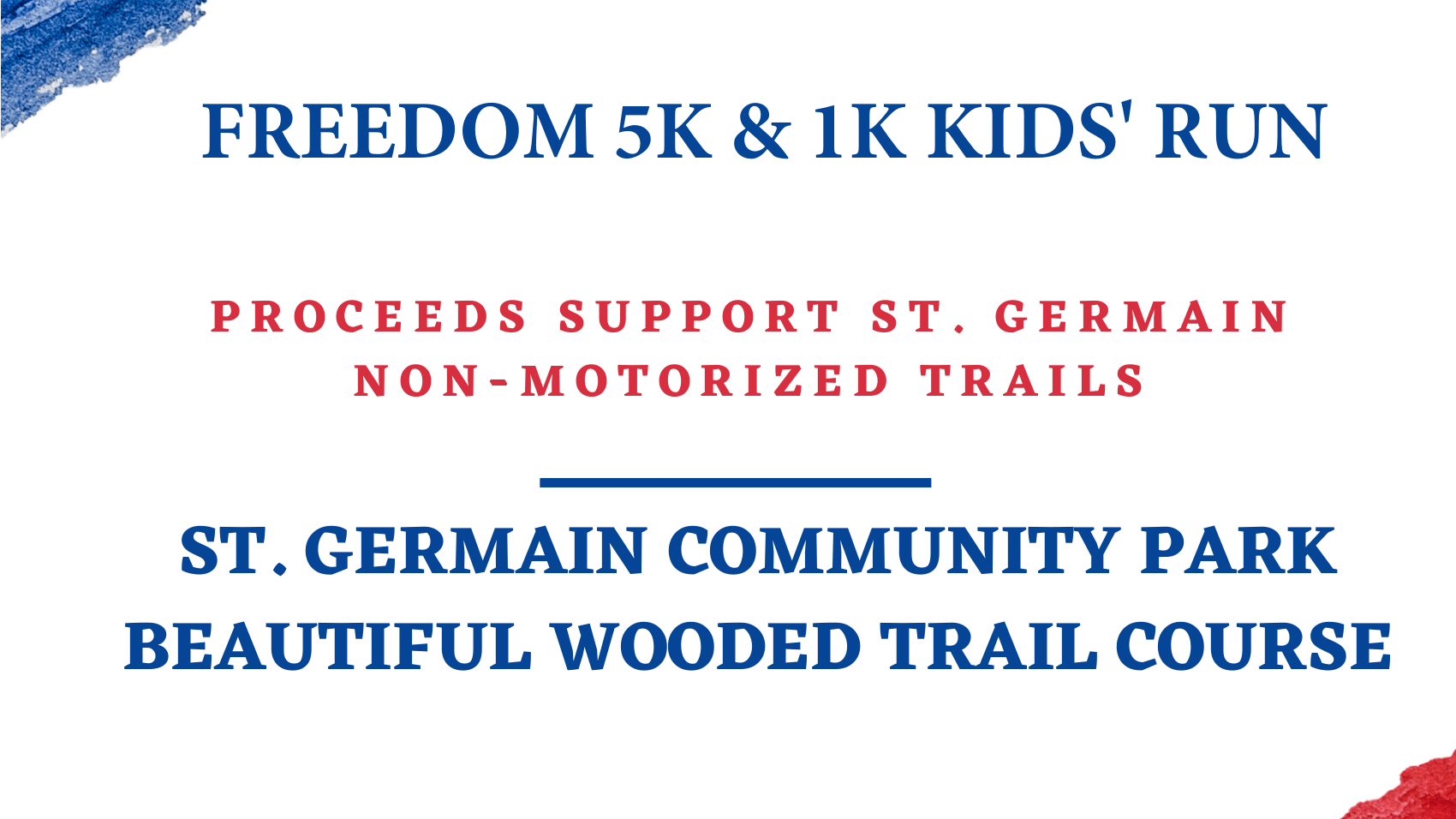 Held in conjunction with St. Germain's Independence Day Celebration, this event includes a 5K chip-timed race starting at 8:30 and a children's 1K fun run at 9:30. Both runs start at the St. Germain Community Pavilion and the 5K utilizes the dirt trails of the Awassa trail system. Proceeds benefit the nonprofit St. Germain Silent…